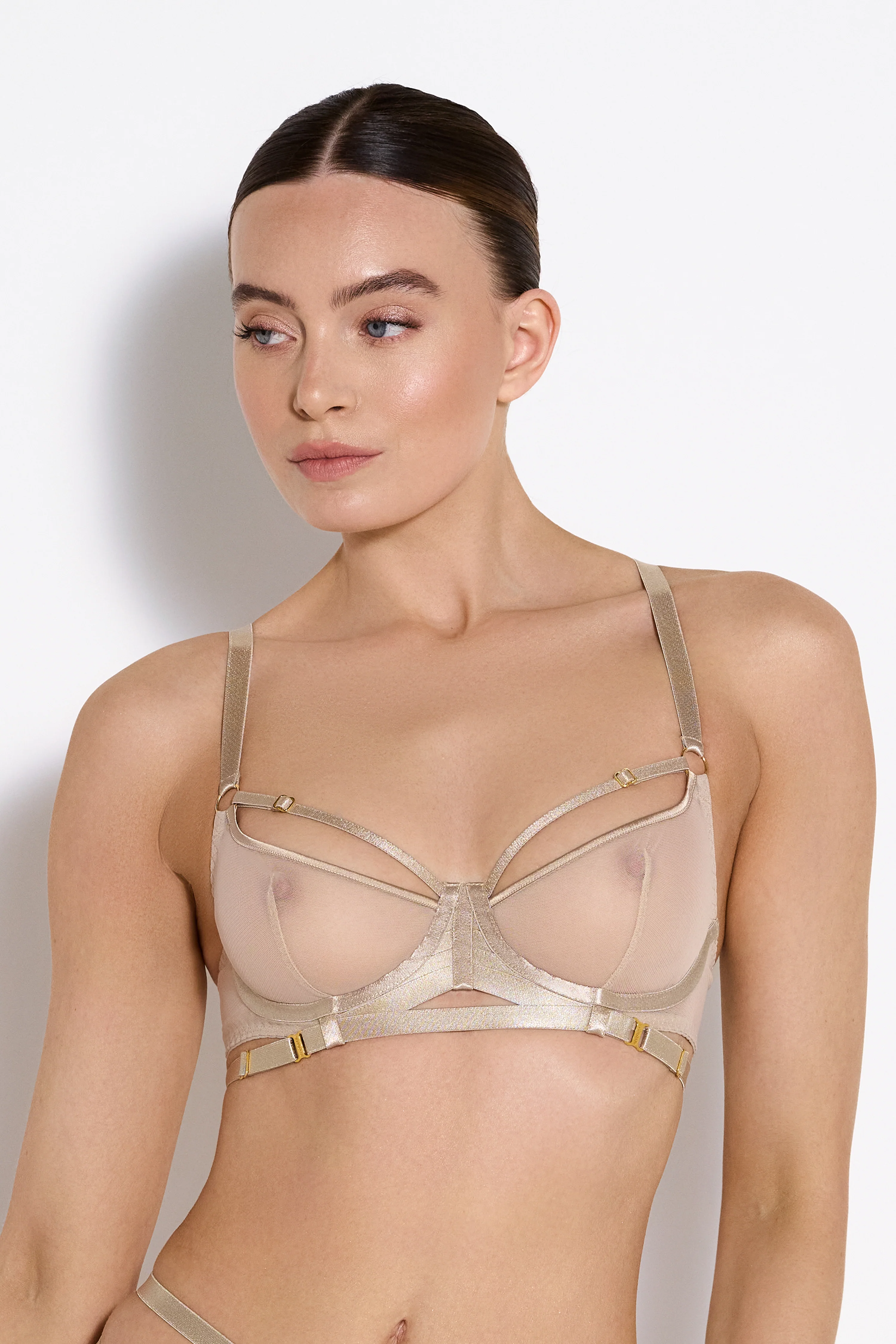A sheer mesh underwired balconette bra finished with adjustable bust straps. An elastic panelling centre front detail, fully adjustable back straps and a 24k gold plated zip fastening ensure a feature is made of every angle.